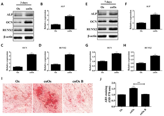 Recent studies have revealed that proinflammatory cytokine networks are involved in osteoblast differentiation and bone metabolism processes [28,29,30,31]; alkaline phosphatase (ALP), osteocalcin (OCN), and Runt-related transcription factor 2 (RUNX2) contribute to the osteogenic differentiation of osteogenic progenitor cells and are considered marker proteins of differentiated osteoblasts [28,32]. Here, osteogenic marker expressions in monocultured and cocultured osteoblasts and calcium deposits were evaluated (Figure 4). Compared with monocultured osteoblasts, those cocultured for 3 or 7 days both exhibited elevated expression of osteogenic markers (ALP, OCN, RUNX2), which contribute to the enhanced osteogenic properties (Figure 4A–H). Relative quantities of stained calcium deposits, which are the product of bone mineralization, were increased in cocultured compared with monocultured osteoblasts, and the increased calcium deposits were attenuated upon inhibition of PD-1/PD-L1 interaction, after which no significant difference with monocultured osteoblasts was observed, as indicated by decreased calcium deposits stained in cocultured osteoblasts treated with BMS 202 (Figure 4I,J). This result indicates that the PD-1/PD-L1 axis not only contributes to the anti-inflammatory action in osteoblasts but also enhances the osteogenic properties mediated by the interaction between osteoblasts and hADMSCs.