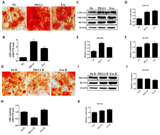 Regulatory effects of exosomal PD-L1 on bone matrix formation in osteoblasts. (A) Regulatory effects on the enhancement of matrix mineralization in PD-L1- and exosome-treated osteoblasts. (B) Stained calcium deposits were dissolved and quantified. N = 5 trials per sample and control. (C) Expression levels of proteins mediating the osteogenic properties upon PD-L1 and exosome treatment. Relative expression levels of (D) COL1A1, (E) PDLIM3, and (F) RUNX2 in osteoblasts. N = 3 trials per sample and control. (G) Attenuation of the enhanced matrix mineralization in PD-L1- and exosome-treated osteoblasts via blocking of PD-1/PD-L1 interaction. (H) Stained calcium deposits were dissolved and quantified. N = 5 trials per sample and control. (I) Expression levels of proteins mediating the osteogenic properties upon the inhibition of PD-1/PD-L1 interaction in PD-L1- and exosome-treated osteoblasts. Relative expression levels of (J) PDLIM3 and (K) RUNX2 in osteoblasts. N = 5 trials per sample and control. Data are presented as mean ± SEM. ** p < 0.01, and *** p < 0.001, compared with the Os and Os B group. Os: osteoblasts; PD-L1: PD-L1 (500 ng/mL); Exo: exosome (10 µg/mL, 2.5 × 108 particles/mL); B: BMS 202 (10 µM).