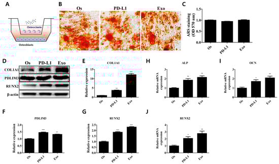 Modulatory effect of exosomal PD-L1 on bone matrix formation in cocultured environment. (A) Osteoblasts and osteoclasts were cocultured to mimic the bone metabolism under physiological conditions. (B) Maintenance of the bone homeostasis in PD-L1- and exosome-treated cocultured osteoblasts. (C) Stained calcium deposits were dissolved and quantified. N = 5 trials per sample and control. (D) Expression levels of proteins mediating the osteogenic properties upon PD-L1 and exosome treatment in cocultured osteoblasts. Relative expression levels of (E) COL1A1, (F) PDLIM3, and (G) RUNX2. N = 3 trials per sample and control. Relative mRNA expressions of osteogenic markers (H) ALP, (I) OCN, and (J) RUNX2. N = 3 trials per sample and control. Data are presented as mean ± SEM. * p < 0.05, ** p < 0.01, and *** p < 0.001, compared with the Os group. Os: osteoblasts (cocultured); PD-L1: PD-L1 (500 ng/mL); Exo: exosome (10 µg/mL, 2.5 × 108 particles/mL).