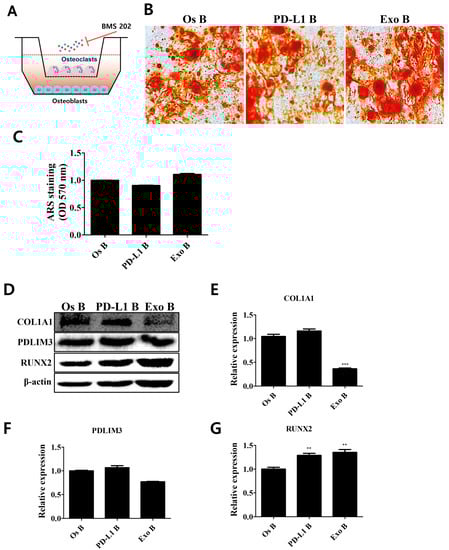 Attenuation of osteogenic properties in cocultured osteoblasts via inhibition of PD-1/PD-L1 interaction. (A) PD-1/PD-L1 interaction was inhibited in the cocultured environment. (B) Maintenance of bone mineralization in cocultured osteoblasts. (C) Stained calcium deposits were dissolved and quantified. N = 5 trials per sample and control. (D) Attenuation of the expression levels of proteins mediating osteogenic properties upon inhibition of PD-1/PD-L1 interaction. Relative expression levels of (E) COL1A1, (F) PDLIM3, and (G) RUNX2. N = 3 trials per sample and control. Data are presented as mean ± SEM. ** p < 0.01, and *** p < 0.001, compared with the Os B group. Os: osteoblasts (cocultured); PD-L1: PD-L1 (500 ng/mL); Exo: exosome (10 µg/mL, 2.5 × 108 particles/mL); B: BMS 202 (10 µM).