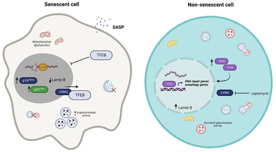 Dysfunctional autophagy has been considered a cellular senescence inducer as damaged proteins or organelles cannot be removed; in line with this, the knockdown of autophagy genes ATG7 and ATG5 in the human primary fibroblast leads to the increased expression of p16INK4A and p21CIP1 and increases β-galactosidase activity. Interestingly, the knockdown of ATG genes induces the accumulation of damaged mitochondria and increases ROS production [56]. The induction of senescence after H2O2 treatment in NIH3T3 cells impairs autophagic flux and decreases lysosomal activity. Nonetheless, the activation of AMPK, a kinase that activates autophagy, restores autophagy flux and lysosomal activity and prevents senescence development [57]; however, autophagy activation has also been shown to promote senescence. As such, the relationship between autophagy and senescence might need further investigation [58]. TFEB, as the main controller of autophagy and lysosome biogenesis, has been linked to senescence in both in vivo and in vitro models of intervertebral disc degeneration, where TFEB decreases its nuclear abundance, leads to lysosomal dysfunction, and decreases autophagy flux. As a consequence, β-galactosidase activity increases, and the expressions of p16INK4A and markers of SASP, such as interleukin-6 (IL-6) and matrix metalloproteinase 3 (MMP3), increase as well. However, when TFEB is overexpressed, senescence is not induced, and autophagy flux is restored (Figure 2) [59]. The accumulation of senescent cells in aged organisms is considered one of many contributors to aging [60]. In the brains of mice at 18 months, specifically in the hippocampus and cortex, Wang et al. [61] showed the decreased expression of nuclear TFEB compared with mice aged 6 months, as well as the increased expression of p16INK4A and γ-H2AX; however, they also found that the overexpression of TFEB ameliorated senescence markers and improved learning and memory skills in mice of the same age [61]. Similar findings were made by Gorostieta et al. [62] in young and old mice hippocampus and cortex; notably, they found that the decreased nuclear TFEB was due to the increased expression of CRM1, which exports TFEB from the nucleus, and this was correlated with the expression of senescence markers in old mice. Interestingly, when they inhibited CRM1 in vitro with leptomycin, nuclear TFEB was augmented, and β-galactosidase activity was reduced; nevertheless, no changes were observed in lamin A/C and lamin B expression after TFEB nuclear restoration [62]. In a cellular model of chronic obstructive pulmonary disease (COPD) emphysema, β-galactosidase activity dropped when cells were treated with gemfibrozil to stimulate TFEB activity, suggesting that TFEB activation could prevent senescence induction. Nevertheless, additional senescence markers need to be outlined in order to propose senescence evasion by the activation of TFEB [63]. Although autophagy induction after TFEB overexpression or activation has been shown as the main mechanism of evading senescence, we cannot discard additional operating mechanisms that TFEB can orchestrate independently of autophagy to delay senescence. As we will discuss in the following section, TFEB induces the transcription of genes related to DNA repair; as the induction of senescence is the result of unresolved DNA damage, overexpressing TFEB might contribute to a better cell response after a cell stress insult and therefore contribute to the evasion of senescence.