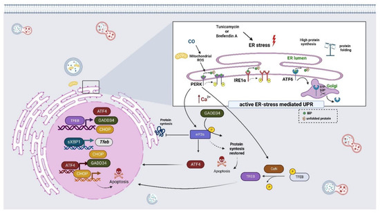 The TFEB regulates the expression of several regulators of the ER stress response. ER stress, triggered by several compounds, promotes the nuclear localization of TFEB in a PERK-, ATF6-, IRE1α-, and calcineurin-dependent manner that consequently induces the transcription of UPR-related genes to restore ER homeostasis and support cell survival or apoptosis, if the stress is persistent.