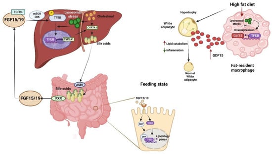 Generally, it is accepted that autophagy is activated under nutrient deprivation conditions and repressed in feeding conditions. Intriguingly, recent data show that after feeding, autophagy/lipophagy is activated in the intestine via the orphan nuclear receptor, the small heterodimer partner (SHP/NR0B2), the gut hormone, fibroblast growth factor-15/19 (FGF15/19), and the TFEB axis (Figure 5). After feeding, FGF15/19 is activated, and in turn, the nuclear localization of SHP and TFEB is increased via PKC-mediated phosphorylation, which consequently activates the transcription of genes (Ulk1 and Atgl) that are essential for lipophagy. This activation may reduce postprandial lipids via lipophagy and may provide novel targets for treating obesity-related metabolic disorders [125]. Intriguingly, TFEB expression was increased in macrophages of white adipose tissue (WAT) from obese mice and humans, whereas macrophage TFEB overexpression protects against obesity and insulin resistance. The livers of mice with HFD-induced weight gain and lipid accumulation were markedly reduced, probably because of the increased expressions of the fatty acid oxidation-related gene and a decrease in lipogenesis-related gene expression. Moreover, macrophage TFEB protected against HFD-induced obesity by inducing growth differentiation factor 15 (GDF15), suggesting that the activation of the TFEB–GDF15 axis could play a crucial role in regulating obesity-induced metabolic diseases (Figure 5) [126]. The estrogen-related receptor α (ERRα) drives lipid metabolism, together with PGC1α/PPAR; nevertheless, recent evidence shows that ERRα is a direct target of TFEB, and both are overexpressed in patients with endometrial cancer [41]. Intriguingly, TFEB and ERRα favor the invasion and metastasis of endometrial cancer cells by modulating lipid metabolism and increasing unsaturated fatty acid phosphatidylcholine, phosphatidylglycerol, and the ratio phosphatidylcholine/sphingomyelin, which together enhance membrane fluidity via epithelial–mesenchymal transformation signaling and promote EC progression [78].