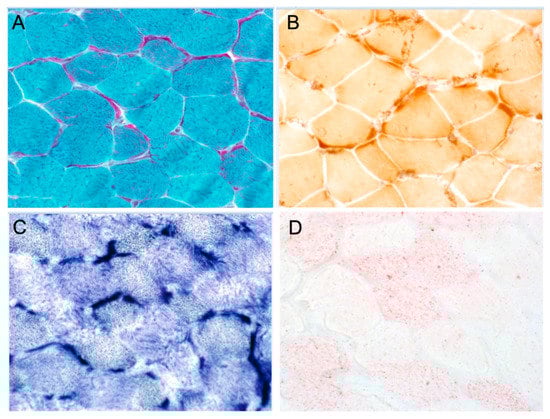 Histochemical and immunohistochemical analyses of muscle biopsy. (A) Gomori trichrome staining shows prominent subsarcolemmal accumulation of mitochondria in most fibers with ragged red-like fibers. (B) COX staining shows no COX-negative fibers, but there is marked subsarcolemmal staining. (C) SDH staining shows marked subsarcolemmal staining. (D) Oil red staining indicates moderate increase in lipid stores.