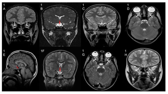 Brain MRI results. Selected MRI sequences and planes showing optic chiasm atrophy (white/red/black arrows) in patient 1 (image (1B) coronal CISS), Patient 2 (image (1C) coronal T2), Patient 4 (image (1E) sagittal T1), and Patient 5 (image (1F) coronal T2). Other selected images also show bilateral optic nerve atrophy (white arrows) in patient 1 (image (1A) coronal T2), Patient 3 (image (1D) axial T2), and Patient 6 (image (1G) axial T2; image (1H) coronal T2).