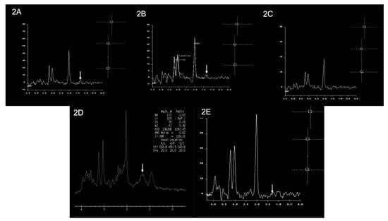 Brain MRS findings of the patients. Multiple single-voxel MRS studies showed small lactate doublets at 1.3 ppm (white arrows) in Patient 1 (image (2A)), Patient 3 (image (2B)), Patient 5 (image (2D)), and Patient 6 (image (2E)). There is no obvious lactate doublet seen in Patient 4 (image (2C)). An MRS study was not performed for Patient 2.