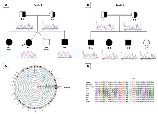 Variant filtering and pathogenicity analyses were evaluated according to standard protocols and up-to-date pipelines applied at the King Faisal Specialist Hospital and Research Center as published before [18,19,20]. Briefly, the variants were filtered using different features such as minor allele frequency (MAF, being <1% in control databases), being in known disease-causing genes, protein loss of function, pathogenic or likely pathogenic according to ACMG (American College of Medical Genetics and Genomics) guidelines [21], and homozygosity. Several bioinformatics prediction tools (SIFT [22], Polyphen2 [23], MutationTaster [24,25], ConDel [26], SNPdryad [27]) were used to predict the pathogenicity of the variant. Next, several publicly available resources were also searched for the presence of the variant and its novelty (listed under web sources). Amino acid sequences from various species were downloaded from the Ensembl database and aligned using ClustalW software. The sequences of 30 amino acids surrounding the variant site were visualized using Jalview and Protean (DNASTAR, Wisconsin, MD, USA). The structure of human RTN4IP1 (residues 45–396) in complex with NADPH was obtained from the PDB (accession number 2VN8). The variant was introduced in silico, and its effect was evaluated using the Pymol program (pymol.org, accessed on 21 February 2022).