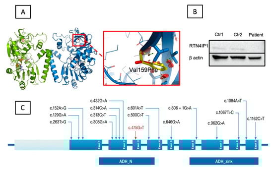Structural analysis and immunoblotting experiment results. (A) The location of the variant within the 3-D crystal structure of RTN4IP1 (PDB ID: 2VN8). RTN4IP1 forms a dimer (green and blue chains). Val159 is shown as a red stick model. The cofactor NADPH is shown as a stick model with carbon atoms in white. The zoom view shows the effect of the p.Val159Phe substitution. Clashes of the Phenylalanine side chain (yellow) are shown as red discs. Key side chains in the vicinity are highlighted as stick models. (B) Immunoblotting analysis results. The Western blotting analysis revealed significantly decreased RTN4IP1 protein levels in the patient’s extracts from cultured fibroblasts in comparison to controls. A polyclonal antibody was targeted against the protein, and beta-actin was used as a control-loading marker. (C) Schematic presentation of RTN4IP1. The top panel shows localization of all previously reported variants (black) and the newly identified novel variant (red) distributed among the nine exons (blue). The bottom panel shows both the alcohol dehydrogenase domain (ADH_N) and the zinc-binding motif (ADH_Zinc).