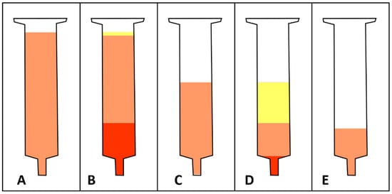 Schematic illustration of macroscopic lipoaspirate morphology after each of the four major steps for tissue processing with the CELT protocol. (A) After it is allowed to sediment under gravitational forces, a syringe is filled with lipoaspirate (illustrated in orange). (B) After the first centrifugation, a large aqueous phase settles at the bottom of the syringe (illustrated in red) and a small oily phase separates at the top of the syringe (illustrated in yellow). The size of the aqueous phase varies depending on the time the tissue is allowed to sediment. The size of the oily phase varies depending on the shear stress the harvesting method has exerted. (C) After the aqueous and oily phases have been discarded, shear-force mechanical processing via intersyringe processing can occur. (D) After mechanical processing and a second centrifugation, a small aqueous and a large oily phases separate from the tissue at the syringe’s top and bottom, respectively. (E) After the aqueous and oily phases have been discarded, a stem cell-enriched lipograft tissue is ready for clinical application.