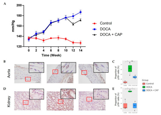 (A) Blood pressure measured every 2 weeks from week 0 to week 14 of the Control, DOCA, and DOCA + Captopril groups. The treatment of DOCA starts from w0. In week 9, DOCA + Captopril groups began to feed captopril (n = 8 for each group). The results of p16 staining in the aorta (B) and kidney (D) with red boxes highlighting the p16-positive cells. (C,E) show the percentage of p16-positive cells in the aorta and kidney, respectively. (* p < 0.05).