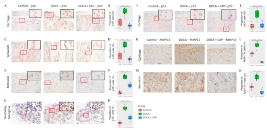 The p16 staining results of cartilage (A), synovium (C), meniscus (E), and secondary spongiosa (G) are shown with the red boxes indicating the p16- positive regions. The percentage of p16-positive cells in the (B) cartilage, (D) synovium, (F) meniscus, and (H) secondary spongiosa in Control (red), DOCA (green), and Captopril-treated group (blue) are plotted. (I,J) The results of p53 staining of cartilage and the percentage of p53-positive cells in the sample. The MMP13 staining of the (K,L) cartilage and (M,N) synovium of the Control, DOCA, and DOCA + Captopril groups, respectively. (*** p < 0.001).