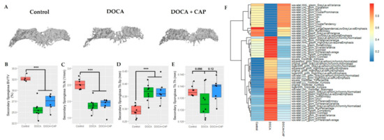 (A) The 3D bone structure of secondary spongiosa under micro-CT with the (B) bone volume ratio (BV/TV), (C) trabecular number (Tb.N), (D) trabecular separation (Tb.Sp), and (E) trabecular thickness (Tb.Th) calculated for the Control, DOCA, and DOCA+Captopril groups, respectively. (*** p < 0.001) (F) The heatmap of the mean values of the top 50 radiomic features quantifying the texture of secondary spongiosa.