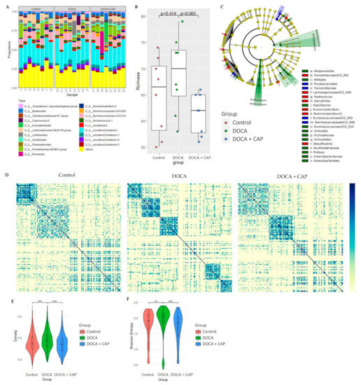 (A) Relative abundance TAXA plot of the top 20 most abundant genus-level taxonclassified sequences from gut bacterial 16S rRNA gene amplicon sequencing (n = 24). (B) The gut microbial genus richness of the Control, DOCA, and DOCA + Captopril groups. A Mann–Whitney U test was conducted, showing a statistically insignificant (p = 0.414) difference between the richness of the control and DOCA groups, while a marginally significant difference could be observed among the DOCA and DOCA + Captopril groups (p = 0.065). (C) Cladogram to demonstrate the linear discriminant effect size of the significant genera. (D) Gut microbial genus correlation networks of the Control, DOCA, and DOCA + Captopril groups, respectively. (E) Density and (F) Shannon entropy of the correlation networks of the Control (red), DOCA (green), and DOCA + Captopril (blue) groups. All the network parameters were compared among the groups through one-way ANOVA with Tukey HSD posthoc analysis (** p < 0.01, *** p < 0.001).