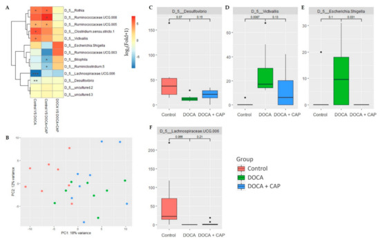 (A) Heatmap of the log-fold-change of the top 13 genus having differential abundance among the Control, DOCA, and DOCA + Captopril groups. (B) The plot of the first 2 principal components (PCs) of the identified bacterial genera’s abundance, with the first PC explaining 18% variance and the second PC explaining 12% variance. (C–F) Box plots show the abundance of the 4 highlighted bacterial genera, and the p-values of pairwise comparison are reported. (* p < 0.05, ** p < 0.01, *** p < 0.001).