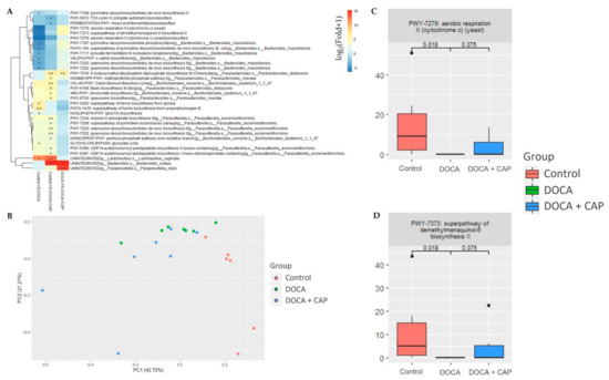 (A) Heatmap of the log-fold-change of the top 32 differentially expressed pathways identified from the taxonclassified sequences from gut bacterial shotgun metagenomic sequencing among the Control, DOCA, and DOCA + Captopril groups. (B) The plot of the first 2 principal components (PCs) of the 32 identified bacterial pathways, with the first PC explaining 18% variance and the second PC explaining 12% variance. (C,D) Box plots demonstrate the expression of the 2 identified bacterial pathways in each group with the p-values of the group comparison reported. (* p < 0.05, ** p < 0.01).