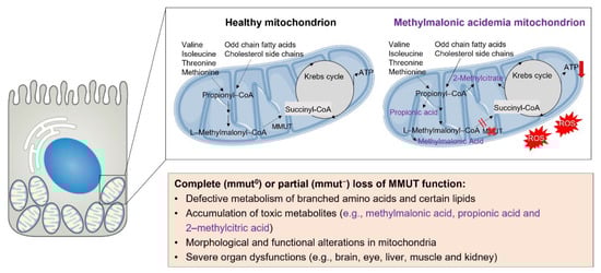 Organic acidemias constitute a large group of inherited, life-limiting disorders of intermediary metabolism, mostly due to defects in the enzymes regulating amino acid catabolism. Methylmalonic acidemia (MMA; MIM #251000)—the most common form of organic acidemias—is caused by inactivating mutations in the MMUT gene encoding methylmalonyl-CoA mutase (MMUT), which is a (vitamin B12-dependent) mitochondrial enzyme that catabolizes branched amino acids and certain lipids to succinyl-CoA, ultimately feeding the tricarboxylic acid (TCA) cycle and energy production. Complete or partial deficiency of the MMUT enzyme (the MMUT0 and MMUT- subtypes, respectively) triggers the accumulation of toxic organic acids (e.g., methylmalonic acid, propionic acid, and 2-methylcitric acid) and leads to abnormalities in the mitochondrial network. Augmented levels of methylmalonic acid have recently been described as inhibiting the electron transport chain (ECT) and, thus, impairing the energy metabolism of mitochondria. The disruption of ETC skews the production of ATP and leads to reactive oxygen species (ROS) and mitochondrial distress []. Apparently, MMUT deficiency, mitochondrial dysfunction, and oxidative stress can impact each other in feed-forward loops. These mitochondrial alterations can drive life-threatening organ dysfunctions, primarily affecting the brain, eye, liver, and kidney (Figure 1). Clinical manifestations and long-term complications have been expertly reviewed elsewhere [,,]. How, mechanistically, the loss of MMUT enzymatic activity begets mitochondrial distress and tissue damage remains poorly understood.