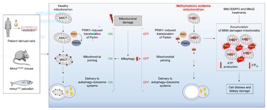 Despite the identification of mitochondrial and cellular defects associated with MMA in different model organisms and cellular systems, little is known about the molecular underpinnings linking the lack of the MMUT enzyme and the resulting storage of toxic metabolites to mitochondrial dysfunction and kidney tubular damage. Given the accumulation of damaged and/or dysfunctional mitochondria in MMA cells, the absence of the MMUT enzyme might sabotage the PINK1–PRKN-mediated priming of MMA-diseased mitochondria and, hence, their clearance by the autophagy–lysosome degradative pathways [,]. Cellular studies suggested that MMA cells display decreases in the number of PRKN+ clusters and translocation of PRKN to dysfunctional mitochondria, under both normal and stress-induced conditions [,], tamping down the clearance of MMA-diseased mitochondria and triggering a level of mitochondrial dysfunction that triggers cellular distress and tubular damage (Figure 2).