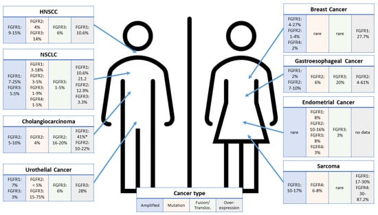 Recent data from the indication-agnostic NCI-MATCH Trial EAY131 (subprotocol W) also confirmed that alterations in FGFR, as detected by next-generation sequencing (NGS), in that tumor tissue is more common across a broad range of tumor diseases than previously expected. Here, various alterations were found also in, e.g., salivary gland tumors, rectal cancer, pancreatic cancer, prostate cancer and other tumors that were considered not to harbor FGFR alterations []. These findings corroborate the results from Schuler et al., who could demonstrate a higher proportion of FGFR-overexpressing patients in their study than expected from The Cancer Genome Atlas (TCGA) data [], e.g., 57% vs. 13% for HNSCC or 46% vs. 30% for squamous NSCLC, whereas data for gastric cancer (19% vs. 18%) or lung adenocarcinoma (11% vs. 12%) matched the database prediction. Interestingly and unexpectedly, it could also be demonstrated in this study that unusual alterations could be detected in the cohort of urothelial cancer patients. Here, 5.5% of enrolled patients showed overexpression of FGFR1 and several cases showed double positivity for FGFR1/2, FGFR1/3 or FGFR2/3 overexpression, which would not be detected by a FISH approach []. Still, a direct comparison of the prevalence of FGFR pathway alterations between different studies or databases needs to be conducted with some precautions, since different cut-offs or methods were applied that may lead to different results.