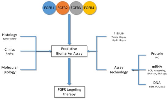 Factors influencing the selection of a predictive biomarker assay for FGFR-inhibitor therapies. Alterations in FGFR1-4 impact on the predictivity of a biomarker assay. In addition to the molecular biology of the alterations (CNV, fusion, mutation, etc.), also, the underlying tumor entity (histology), the clinical staging (e.g., muscle-invasive vs. non-muscle-invasive bladder cancer), tissue availability and the assay technology with different target readouts (protein, mRNA, DNA) determine which FGFR targeting therapy would bring benefit to a patient.