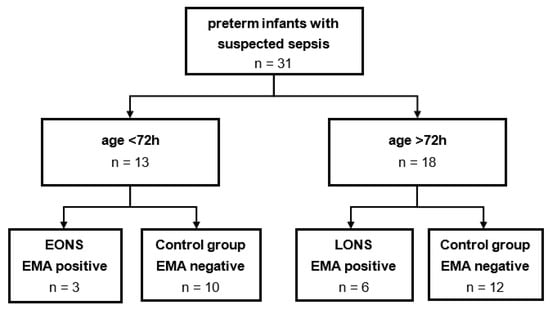 Flow diagram for study cohort subdivision. A total of 31 samples of preterm infants with suspected sepsis were collected. After the division by age at blood collection, remaining study cohorts were analyzed retrospectively for the occurrence of clinical sepsis according to EMA sepsis scoring system.