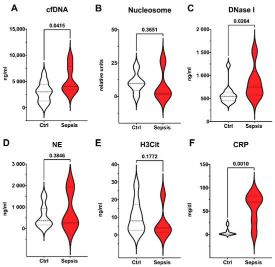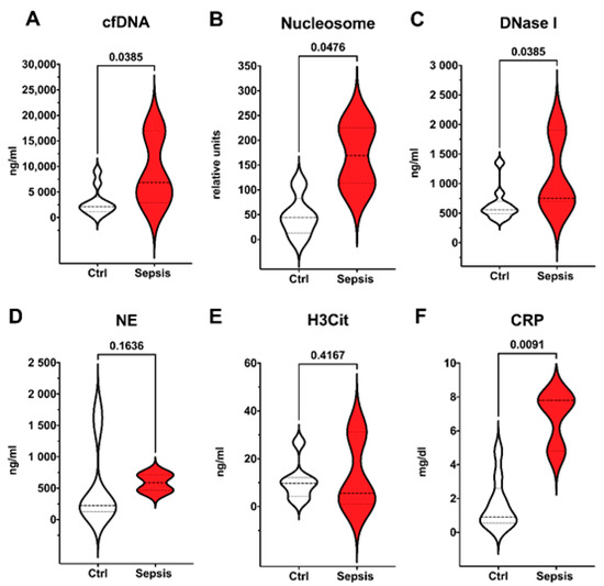 In the first days of life, the immune system is faced with a broad spectrum of microbes and pathogens for the first time. As a crucial part of the innate immune system especially in neonates, neutrophils represent the first defense line against them [1,9]. This subpopulation of leucocytes can attack and immobilize pathogens by releasing neutrophil extracellular traps (NETs) [9,10]. NETs consist of DNA filaments, citrullinated histones, and proteolytic enzymes, such as neutrophil elastase (NE) [11]. Degradation of NETs by deoxyribonucleases (DNases) ensures homeostasis of the immune response [10]. The cytokine storm during septic shock may lead to an imbalance of NET formation and NET degradation, resulting in complications like thrombotic events and tissue damage [12,13,14]. Elevated markers of NET formation are described in the context of sepsis and other inflammatory diseases [13]. Aim of this study was to evaluate the value of markers of NET formation and turnover for sepsis diagnosis in a collective of preterm neonates.