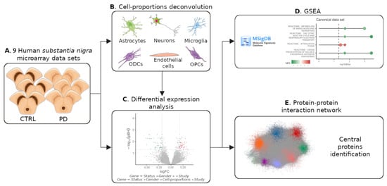 Summary of this study. (A) Human substantia nigra microarrays from PD and CTRL were downloaded from GEO. (B) Cell-proportion deconvolution for six cell types. (C) Differential expression analysis with and without cell proportions. (D) GSEA on the expression matrix. (E) Central protein identification in PPI network around detected differentially expressed genes. Drawings of substantia nigra and cells were obtained from Servier Medical Art templates (Creative Commons Attribution 3.0 Unported License; https://smart.servier.com accessed on 1 May 2021).