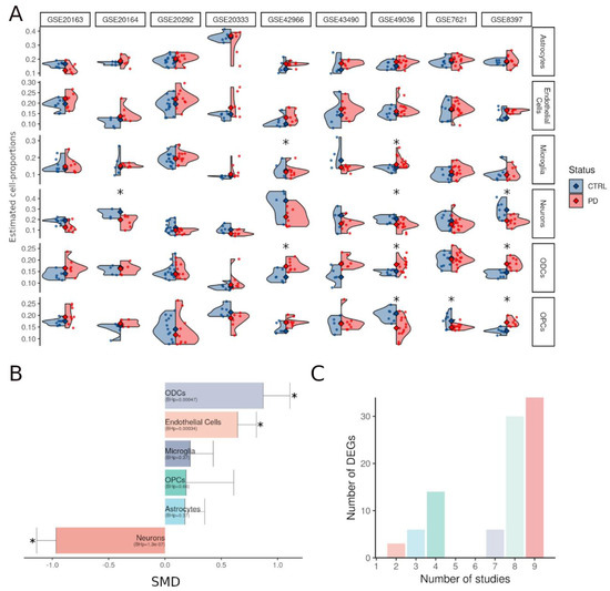 Cyto-architectural heterogeneity as estimated from bulk transcriptomics using the deconvolution strategy of TOAST. (A) Cell estimates of six cell types in substantia nigra across different datasets and conditions. Blue, CTRL; red, PD. Significant variations are indicated by asterisk (p < 0.05). (B) Bar plot of the standardized mean differences (SMD) in cell estimates from the random-effects meta-analysis conducted with metafor. BH-adjusted p-values are reported between brackets, significant differences are indicated by asterisks “*” (BH p < 0.05), and standard errors for each cell type are reported as error bars. (C) Number of DEGs of the cell proportion-aware LMM probed by a specific number of microarrays in our dataset.