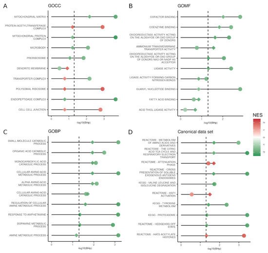 Comparison of the GSEA for the genes ranked by the two linear mixed models (LMMs). Top 10 significant hits of the cell proportion-aware (second) LMM (diamond) compared with their respective values from the cell proportion-unaware (first) LMM (circle). Each shape is colored by the normalized enriched scores (NES); −log10 of the adjusted p-value is reported on the x-axis. The significance threshold (BHp = 0.05) is indicated by the dashed vertical line. (A) Top results for gene ontology cellular component (GOCC); (B) Top results for gene ontology molecular function (GOMF); (C) Top results for gene ontology biological process (GOBP); (D) Top results for canonical data set.