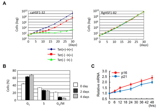 As already described, overexpression of HSF1 increases the proportion of G1 cells in HeLa cells under non-heat-stressed conditions [55]. Hayashida and his colleagues established that the HeLa cells in which constitutive active HSF1 (caHSF1) [94,95] or DNA binding activity-lacking mutant HSF1 (RgHSF1) are inductively expressed using the tet-off system. The caHSF1 lacks a regulatory domain and thus exhibits constitutive transcriptional activity (Figure 1A). RgHSF1 has an amino acid mutation at R71, and this arginine (R) amino acid is replaced by glycine (G). This R71G mutation diminishes DNA binding activity (Figure 1A, 94,95). They discovered that caHSF1-expressing cells proliferate at a very low speed (Figure 2A, left, [96]). In contrast, both RgHSF1-expressing cells and caHSF1 expression-inhibited cells proliferate normally (Figure 2A, right, 96). They examined the cell population and found that G1 phase cells were increased 1.5-fold and G2/M phase cells decreased by 25% in caHSF1-expressing cells (Figure 2B, 96).