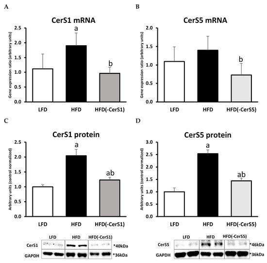 The impact of in vivo CerS1 and CerS5 gene silencing on the mRNA and protein expression of CerS1 and CerS5 in the mouse gastrocnemius muscle: Panels (A,C)—the expression skeletal muscle CerS1 at the mRNA and protein level, respectively; Panels (B,D)—the expression skeletal muscle CerS5 at the mRNA and protein level, respectively. Values are mean ± SD (n = 8 per group); a—p < 0.05 vs. LFD; b—p < 0.05 vs. HFD; significance by ANOVA; LFD-low-fat diet, HFD—high-fat diet. The observed molecular weight of indicated proteins is different to the theoretical one, as stated by the antibody manufacturer.
