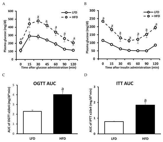 Impact of high-fat diet (HFD) consumption on plasma glucose profile during oral glucose tolerance test (OGTT) and intraperitoneal insulin tolerance test (ITT): Panel (A)—plasma glucose profile during OGTT; Panel (B)—plasma glucose profile during IPTT; Panel (C)—area under the plasma glucose curve (AUC) for OGTT; Panel (D)—area under the plasma glucose curve (AUC) for IPTT. Values are mean ± SD (n = 6 per group); a—p < 0.05 vs. LFD; significance by t-test.
