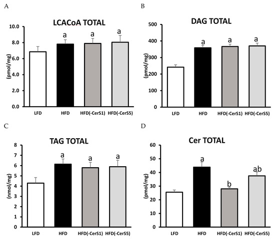 Impact of CerS1 and CerS5 gene silencing on the content of individual sphingolipids in mouse gastrocnemius muscle of HFD-fed animals. Values are mean pmol/mg of tissue ±SD; n = 8 per group; a—p < 0.05 vs. LFD; b—p < 0.05 vs. HFD.