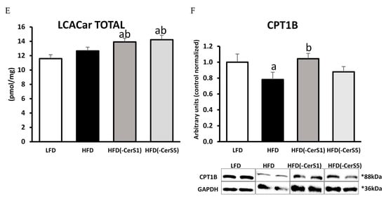 The impact of CerS1 and CerS5 silencing on the content of bioactive lipids, acyl-carnitines, and the protein expression of CPT1B in gastrocnemius muscle of HFD-fed mice: Panel (A)—total content of LCACoA; Panel (B)—total content of DAG; Panel (C)—total content of TAG; Panel (D)—total Cer content; Panel (E)—total content of acyl-carnitines, Panel (F)—protein of CPT1B. Values are mean ± SD (n = 8 per group); a—p < 0.05 vs. LFD; b—p < 0.05 vs. HFD; significance by ANOVA; LFD-low-fat diet, HFD—high-fat diet. The observed molecular weight of indicated proteins is different to the theoretical one, as stated by the antibody manufacturer.