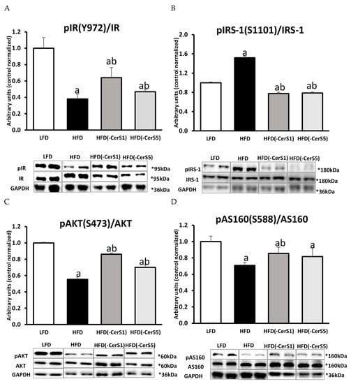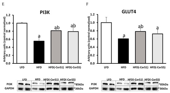 Activation of insulin signaling pathway in CerS1 and CerS5-silenced gastrocnemius muscle of HFD-fed mice: Panel (A)—insulin receptor tyrosine phosphorylation (pIR Y972); Panel (B)—IRS1 serine phosphorylation (pIRS S1101); Panel (C)—serine phosphorylation of protein kinase B/Akt (pAKT S473); Panel (D)—serine phosphorylation of Akt/PKB 160 kDa substrate (pAS160 S588); Panel (E)—protein expression of phosphoinositide 3-kinase (PI3K); Panel (F)—protein expression of glucotransporter 4 (GLUT4). Values are mean ± SD (n = 8 per group); a—p < 0.05 vs. LFD; b—p < 0.05 vs. HFD; significance by ANOVA; LFD-low-fat diet, HFD—high-fat diet. The observed molecular weight of indicated proteins is different to the theoretical one, as stated by the antibody manufacturer.