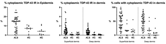 TDP-43 cytoplasmic deposition and its clearance from the nucleus have been observed beyond motoneurons in other areas of the nervous system, and in extra-neural tissues [19,29,30,31,32,33]. However, few studies have explored the presence of TPD-43 protein in skin of ALS patients, and quantitative information from the dermis of skin biopsies was missing. Suzuki et al. [14] analyzed skin biopsies from 15 ALS patients and 15 neurological controls and found higher amounts of TDP-43 in the ALS group, although they did not report on the nuclear/cytoplasmic localization of the protein. They also observed TDP-43 immunoreactivity in both neurological controls and ALS in blood vessels and glands, but it was lower in the case of controls [30]. In a tissue-engineered model derived from fibroblasts of 12 ALS patients (six sporadic and six familial C9ORF72 cases), an increased accumulation of cytoplasmic TDP-43 was found in ALS patients (30%) compared to HC (4%) in epidermis, dermo-epidermal junction, and dermis [14]. Wang et al. [15] observed in patients harboring the TARDBP A315T mutation that the presence of cytoplasmic TDP-43 occurs mainly in epidermis but also in dermis, although no quantification was performed. Another study with skin biopsies from 22 ALS patients and 26 neurological controls (neuropathies) [19] analyzed TDP-43 mRNA expression, epidermal TDP-43 immunoblot and percentage of TDP-43-positive cells in epidermis. They did not find differences in the immunohistochemical analysis, although differences in immunoblot TDP-43 expression with a reduction of mRNA in ALS epidermis suggested a dysregulation of protein expression.