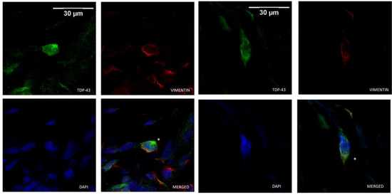 Cytoplasmic TDP-43-positive cells (*) were identified as fibroblasts based on vimentin immunoreactivity. Representative confocal microscopy images of ALS dermal fibroblasts co-immunolabeled for TDP-43 (in green), vimentin (in red) and DAPI nuclear staining (in blue).