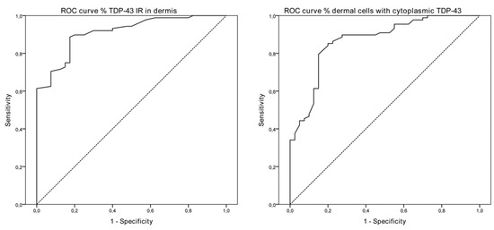 ROC curves of the percentage of TDP-43 immunoreactivity in both layers of the dermis (AUC 0.911, CI 95% 0.862–0.960, p < 0.001) and of the percentage of dermal cells with cytoplasmic TDP-43 labeling (AUC 0.867, CI 95% 0.800–0.935, p < 0.001) in ALS patients. ROC: receiver operation characteristic; AUC: area under the ROC curve.