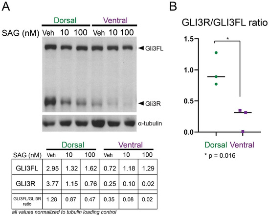 While previous studies have indicated that Gli3 transcript is present in both dorsal and ventral V-SVZ [16], the relative levels of repressor (cleaved) and full-length forms of the protein have not been reported. We therefore measured the presence of both protein forms in cultured neonatal (P2) progenitor cells via Western blotting (Figure 1). Both dorsal and ventral cells expressed the full-length form of GLI3 (170 kDa), while dorsal cells had higher levels of the shorter GLI3R form (83 kDa). As expected, addition of the small molecule Smoothened agonist (SAG, 10 nM or 100 nM [Selleck Chemicals, Cat #S7779, Houston, TX, USA]) resulted in decreased levels of GLI3R in all cultures, while addition of 250 or 500 nM cyclopamine conversely resulted in decreased levels of the full-length GLI3 (data not shown).