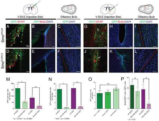 - Balordi, F.; Fishell, G. Mosaic removal of hedgehog signaling in the adult SVZ reveals that the residual wild-type stem cells have a limited capacity for self-renewal. J. Neurosci. 2007, 27, 14248–14259. [Google Scholar] [CrossRef]