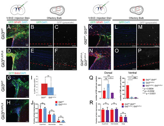 Removal of GLI3 or GLI2/GLI3 does not alter olfactory interneuron production in the dorsal V-SVZ: Ad-GFAPp-Cre virus was injected in dorsal V-SVZ in CAG, Gli3FLX/FLX; CAG, or Gli2FLX/FLX; Gli3FLX/FLX; CAG animals, and brain tissue was analyzed 30 days after injection. Approximate locations of the imaged areas are indicated by red boxes. GFP/GFAP double-labeled cells were found at the injection site (A,D,K,N), and GFP-labeled progeny were scored in the olfactory bulb for all sites and genotypes (B,E,L,O; GFP alone shown in C,F,M,P). Scale bars—50 microns; red dashed lines indicate the core of the olfactory bulb. Ablation of GLI3 in the dorsal V-SVZ did not alter the fraction of GFP-positive cells that also incorporated BrdU (G–I). No difference in the location of interneurons in the granular layer was seen for any genotype (J,R). Ventral injection in either Gli3FLX/FLX; CAG animals or Gli2FLX/FLX; Gli3FLX/FLX; CAG animals resulted in a substantial reduction in the number of interneurons per tissue slice in the olfactory bulb; this was not seen after dorsal injections (Q).