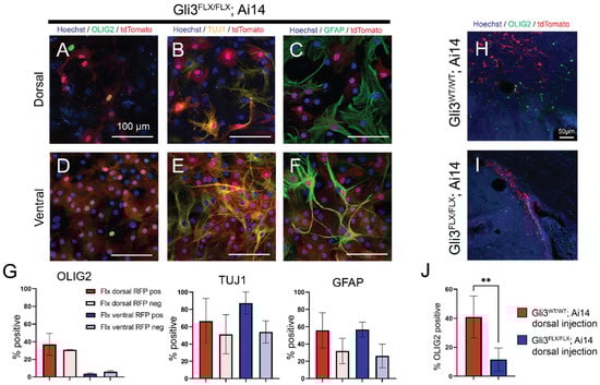 Progenitors of the V-SVZ, in addition to olfactory bulb interneurons, also generate oligodendrocytes, both during normal development and in adulthood after injury. SHH signaling has also been implicated more broadly in astrocyte production and activation [33]. To examine the production of glia by dorsal and ventral progenitor cells, cultures were prepared from each subregion in postnatal day 2 Gli3FLX/FLX; Ai14 animals as well as Ai14-only controls. Prior to in vitro differentiation by reduction in growth factors, cultured progenitors were transduced with Ad:CMV-Cre to induce loss of the GLI3 protein and expression of tdTomato. Following 14 days of differentiation, marker expression for neuronal, oligodendroglial and astroglial differentiation was quantified and compared between tdTomato-positive cells and uninfected control cells within the same well, as well as Ai14-only controls (Figure 4 and data not shown). All cultures yielded TUJ1-positive neurons, OLIG2+ oligodendrocyte lineage cells, and GFAP-positive astrocytes. A higher fraction of OLIG2+ cells (37%) were seen in dorsally derived cultures (Figure 4A,D,G) relative to matched ventral counterparts (3.7%, p = 0.03, unpaired t-test)); however, the proportion of cells which were OLIG2-positive did not change when GLI3 was lost (30.4% dorsal, 3.7% ventral). Similarly, no differences were seen between corresponding wild-type cultures without Cre (30% OLIG2+ in dorsal, 1% in ventral, data not shown). GFAP-positive and TUJ1-positive cells were also present in all cultures and did not vary by genotype (GFAP: Figure 4C,F,G; TUJ1: Figure 4B,E,G). As oligodendrogenesis continues in the postnatal period in vivo, and may not be fully reflected by neonatal progenitor cultures, we also analyzed the effects of GLI3 ablation on production of OLIG2+ cells in the adult dorsal V-SVZ. Gli3FLX/FLX; Ai14 animals or Ai14-only controls were injected in the dorsal V-SVZ with Ad:GFAPp-Cre, and the percentage of RFP-labeled cells expressing OLIG2 was quantified 30 days after injection (Figure 4H–J). Surprisingly, while many OLIG2+ labeled progeny were found in control animals (40% of RFP+ cells at the injection site), this percentage was substantially decreased in Gli3FLX/FLX; Ai14 animals (12%), indicating that GLI3 is required for functional postnatal oligodendrogenesis from dorsal V-SVZ.