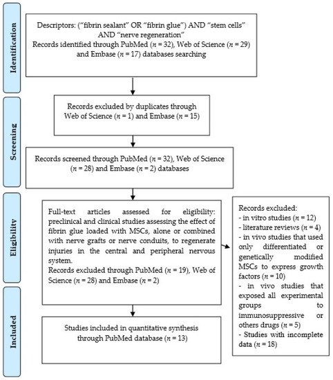 This systematic review was conducted according to the PRISMA guidelines and the PICO strategy (Patient, Intervention, Comparison and Outcomes). The electronic bibliographic search was carried out in August–September/2021 in the PubMed/MEDLINE, Embase and Web of Science databases, combining the descriptors (“fibrin sealant” OR “fibrin glue”) AND “stem cells” AND “nerve regeneration”. The design of this review involved studies published up to the year 2021 that evaluated the effect of therapy with MSCs associated with fibrin glue on central and peripheral nervous system regeneration.