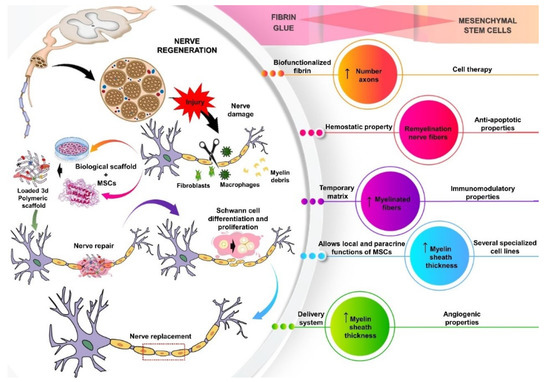 Schematic illustration of central or peripheral nervous system regeneration through cell therapy associated with a 3D polymeric matrix of fibrin. Furthermore, it explains the intrinsic characteristics of each, a proportionally synergistic effect when associated. The mesenchymal stem has angiogenic, anti-apoptotic and immunomodulatory properties, in addition to its ability to differentiate into several specialized cell lines. Fibrin glue has hemostatic properties and acts as a temporary matrix that favors cell-matrix interactions and allows local and paracrine functions of MSCs. In the nervous repair process, events occur that signal a disturbance in the homeostasis of the microenvironment, which leads to changes in cell metabolism, with consequent activation of several signaling pathways and regulation of gene expression. At this stage, the MSCs differentiate into Schwann cells, they overexpress neurotrophins and other growth factors involved in neuronal regeneration and the binding sites in the fibrin network provide interaction with macrophages and fibroblasts, aiding Wallerian degeneration, phagocytizing fragmented axons and myelin debris and sequentially regeneration nervous.