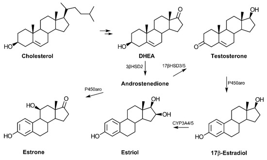 In terms of biosynthesis, the conversion of cholesterol to pregnenolone is the first step in the production of dehydroepiandrosterone (DHEA) (reviewed in Ref. [14]) (Figure 1). Following cellular uptake, systemic DHEA-sulfate (DHEA-S) is converted into the non-sulfated DHEA, which is then metabolized to other hormones depending on the tissue. DHEA serves as a common precursor to androgens and estrogens via the production of androstenedione, which can then be converted to testosterone. Testosterone is an androgen that can be produced from DHEA in the testes and prostate and may serve as a precursor to the estrogens. In addition to its role in promoting features associated with masculinity, testosterone has also been reported to influence cognitive function in an age-dependent fashion [15]. DHEA is an established source for the biosynthesis of the three primary estrogens: estrone, 17β-estradiol, and estriol. The primary estrogen receptors (ER), ERα and ERβ, have genes that are present on chromosome 14, while the androgen receptor gene is localized on the X chromosome [16,17].