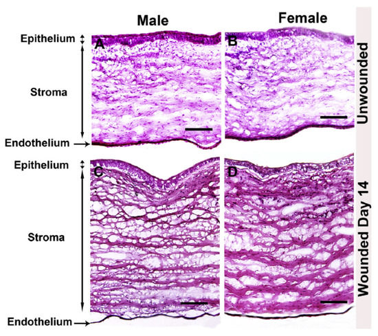 Comparative study of male and female rabbit corneas following wounding. Hematoxylin and eosin stain of unwounded and wounded (A,C) male and (B,D) female rabbit corneas. Image re-produced from [49] with permission (https://doi.org/10.1016/j.exer.2019.107705, accessed 13 December 2021).