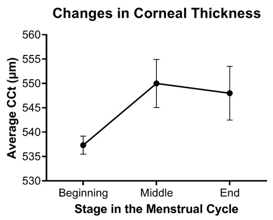 Relative changes in stromal thickness as a function of the menstrual cycle. Data based on the average central corneal thickness (CCT) reported at each stage in references [57,58,59]. Mean ± standard error shown, with n = 3.