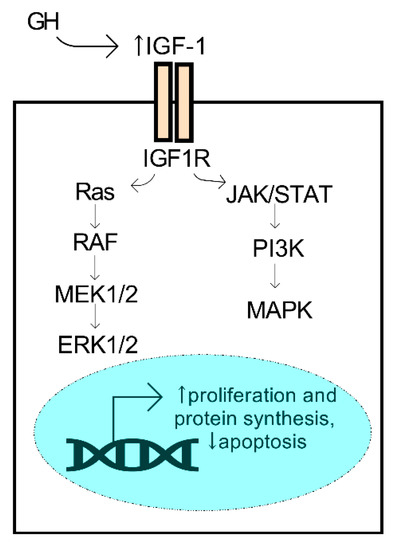 Activation of the GH/IGF-1 axis promotes pro-survival mechanisms. GH secreted from the pituitary gland may promote an increase (↑) in systemic IGF-1, a ligand of the IGF1R receptor, leading to activation of the ERK1/2 and MAPK kinases and downstream activators.