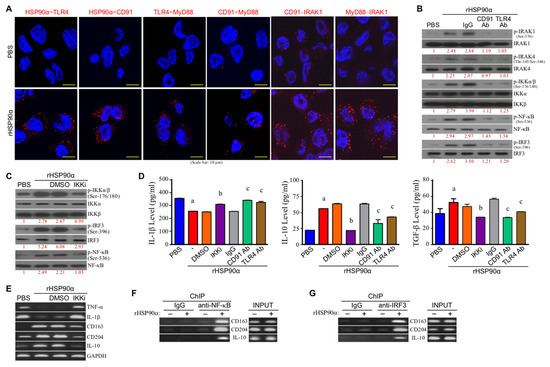 B) Levels of IRAK1, phosphorylated IRAK1, IRAK4, phosphorylated IRAK4, IKKα, IKKβ, phosphorylated IKKα/β, NF-κB, phosphorylated NF-κB, IRF3, and phosphorylated IRF3 in the THP-1-derived macrophages treated with PBS, rHSP90α, or rHSP90α plus control IgG or anti-CD91 or TLR4 antibody. The immunoblot data shown are the representative of three independent experiments. The numbers below the image sets are the relative levels of the phosphorylated proteins after normalization to their respective protein total levels. (