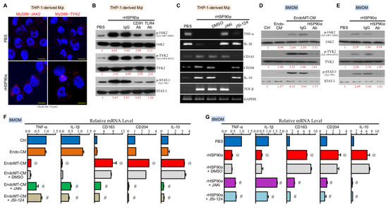 A CD91 and TLR4 receptor-associated MyD88–JAK2/TYK2–STAT-3 signaling axis is involved in eHSP90α-induced macrophage M2-polarization. (A) Red fluorescent dots in PLAs showed that the physical associations of MyD88–JAK2 and MyD88–TYK2 were induced when THP-1-derived macrophages were treated for 4 h with 15 μg/mL of rHSP90α. The representative data of three independent experiments are shown. (B) Levels of JAK2, phosphorylated JAK2, TYK2, phosphorylated TYK2, STAT-3, and phosphorylated STAT-3 in the THP-1-derived macrophages treated for 4 h with PBS, 15 μg/mL of rHSP90α, or rHSP90α plus control IgG or anti-CD91 or TLR4 antibody. The immunoblot data shown are the representative of three independent experiments. Relative levels of the phosphorylated proteins are indicated below the image sets after normalization to the respective protein total levels. (C) mRNA levels of TNF-α, IL-1β, CD163, CD204, IL-10, and TGF-β in the THP-1-derived macrophages treated for 24 h with PBS, rHSP90α, or rHSP90α plus DMSO, 10 nM JAK2 inhibitor (JAKi; cat. #420099, Merck KGaA), or 10 μM JSI-124 (Cucurbitacin I, another JAK2/TYK2 inhibitor; cat. #238590, Merck KGaA). The representative RT-PCR data of three independent experiments are shown. (D) Levels of JAK2, phosphorylated JAK2, TYK2, phosphorylated TYK2, STAT-3, and phosphorylated STAT-3 in the BMDMs treated 4 h with control medium (Ctrl), Endo-CM, EndoMT-CM, or EndoMT-CM plus control IgG or anti-HSP90α antibody. The immunoblot data shown are the representative of three independent experiments. Relative levels of the phosphorylated proteins were denoted below the image sets after normalization to the respective protein total levels. (E) Levels of JAK2, phosphorylated JAK2, TYK2, phosphorylated TYK2, STAT-3, and phosphorylated STAT-3 in the BMDMs treated 4 h with PBS, rHSP90α, or rHSP90α plus control IgG or anti-HSP90α antibody. The immunoblot data shown are the representative of three independent experiments. Relative phosphorylated protein levels are indicated below the image sets. (F) mRNA levels of TNF-α, IL-1β, CD163, CD204, and IL-10 in the BMDMs treated for 24 h with control medium (Ctrl), Endo-CM, EndoMT-CM, or EndoMT-CM plus DMSO, JAKi, or JSI-124. The mean ± SD of qPCR data were obtained from three independent experiments. @ p < 0.01 when compared with “Ctrl” group. # p < 0.01 when compared with “EndoMT-CM + DMSO” group. (G) mRNA levels of TNF-α, IL-1β, CD163, CD204, and IL-10 in the BMDMs treated for 24 h with PBS, rHSP90α, or rHSP90α plus DMSO, JAKi, or JSI-124. The qPCR data shown are the mean ± SD of three independent experiments. @ p < 0.01 when compared with “PBS” group. # p < 0.01 when compared with “rHSP90α + DMSO” group.