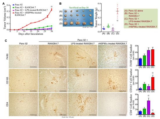 eHSP90α-induced M2-polarized macrophages exhibit significant tumor-promoting activity. (A,B) Promotion of the tumor growth of Panc 02 cell grafts by rHSP90α-treated macrophages. C57BL/6 mice were subcutaneously injected with Panc 02 cells alone or together with the RAW264.7 cells pretreated for 24 h with 100 ng/mL of LPS or 15 μg/mL of rHSP90α (n = 5 per group). The sizes of developing tumors were superficially measured using a Vernier caliper and their volumes were calculated with the formula of ½ × length × width2 (A). Mice were sacrificed on day 30 post-inoculation and tumors were removed (B). @ p < 0.01 when compared with “Panc 02” or “Panc 02 + RAW264.7”. (C) IHC of F4/80, CD163, and CD4 from the tumors formed by Panc 02 cells alone (designated as “Panc 02” group) or Panc 02 cells mixed with PBS-, LPS-, or rHSP90α-treated RAW264.7 cells (designated as “Panc 02 + RAW264.7”, “Panc 02 + LPS-treated RAW264.7”, and “Panc 02 + rHSP90α-treated RAW264.7” groups, respectively). Quantification of IHC was performed by counting positively stained cells from 3~5 high power fields of each tissue section. @ p < 0.05 when compared with “Panc 02” or “Panc 02 + RAW264.7” group.